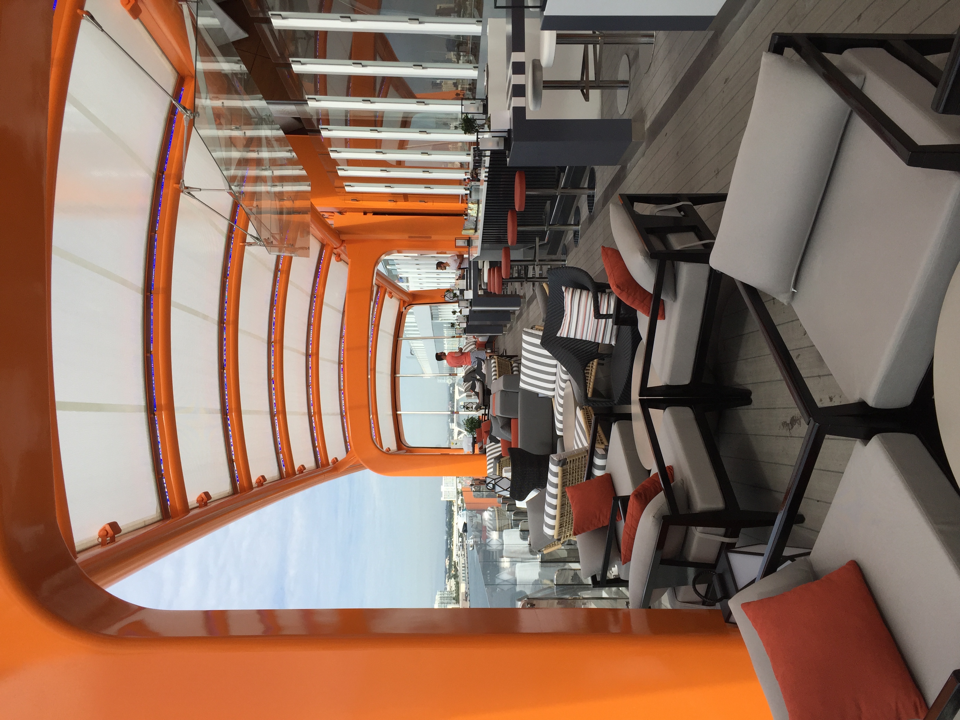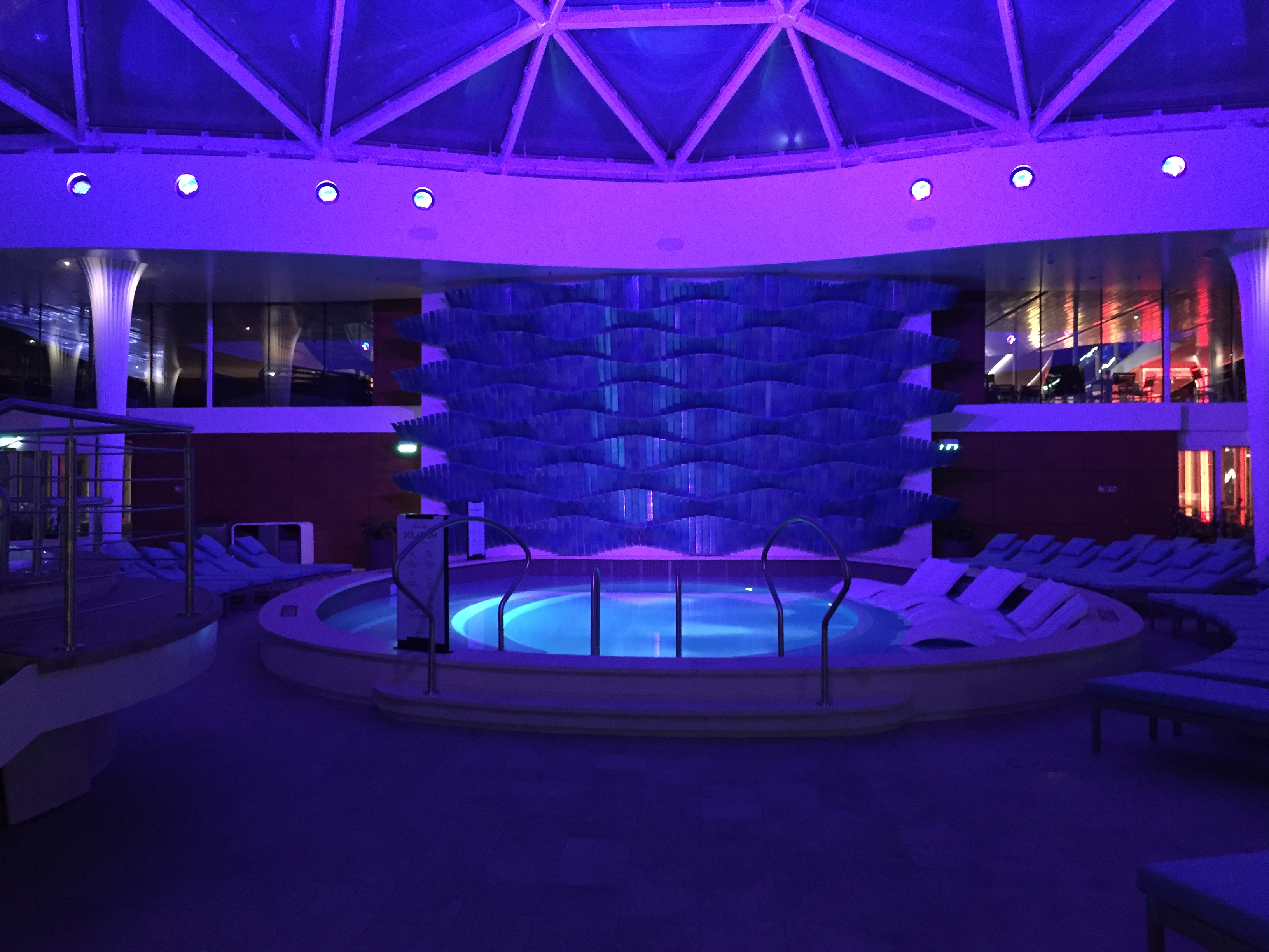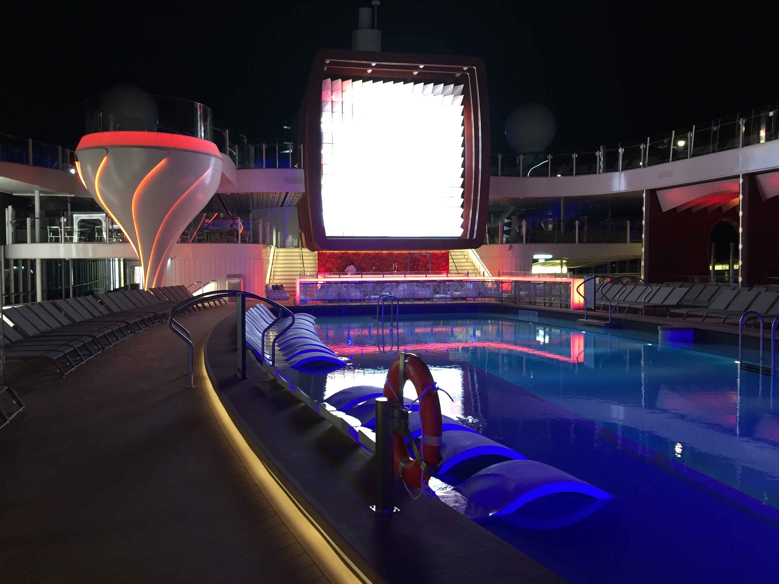 There are so many great areas of the ship to relax in, it’s hard to know where to start.  Want a champagne glass hot tub.  Got it.  Want a private cabana.  Ok, for an extra charge we will hook you up.  Adult Solarium, yep.  Want to watch a movie or the big game outside under the stars, check out the rooftop bar.  Want to have lunch alfresco hanging over the ocean, check out the magic carpet.  The Sunset Bar on the back of the ship is an awesome place to take in great views of the ocean.  Of course there is the spa, which will be explored in a future post.  You really can’t go wrong in picking a spot to relax.