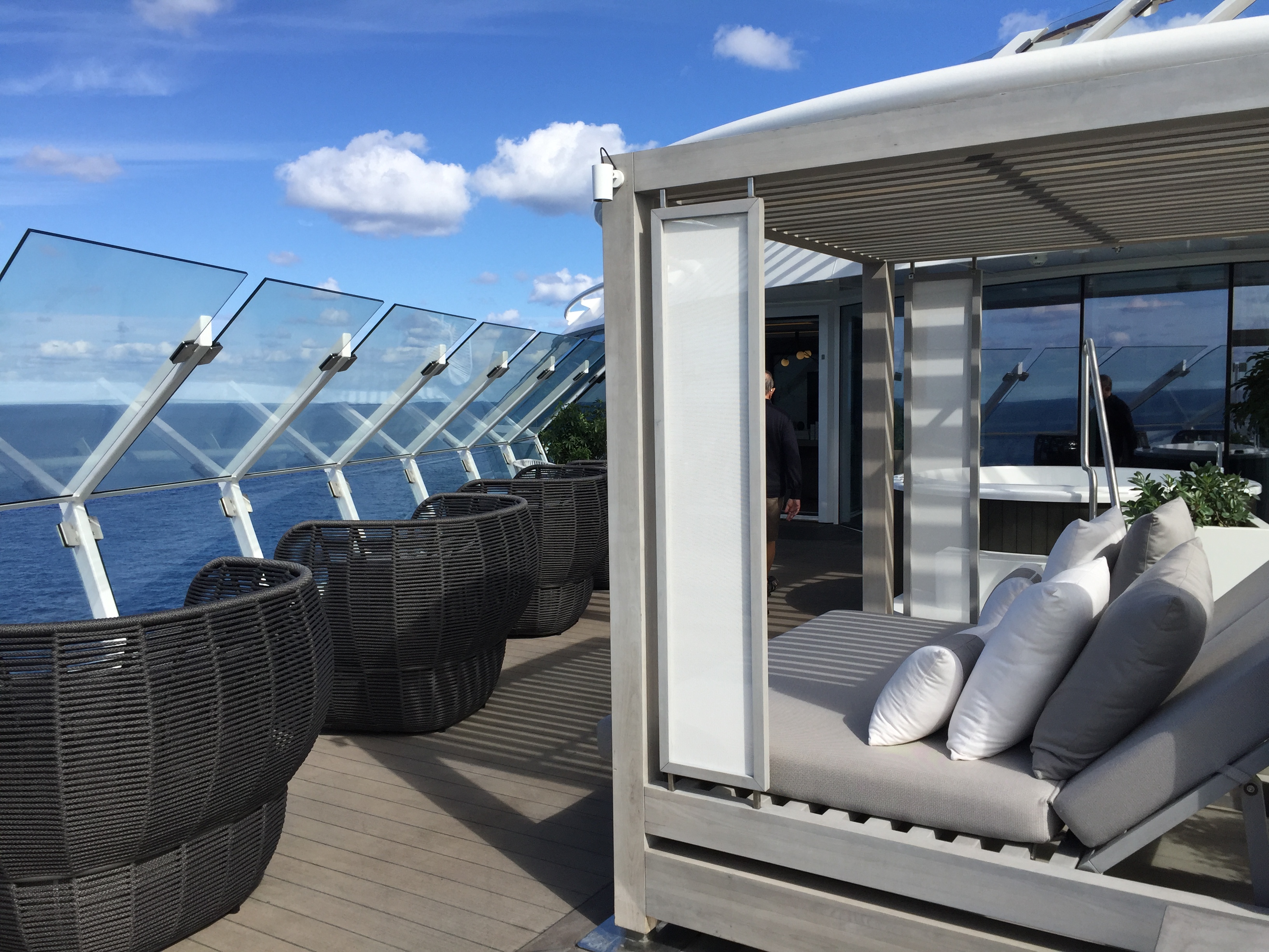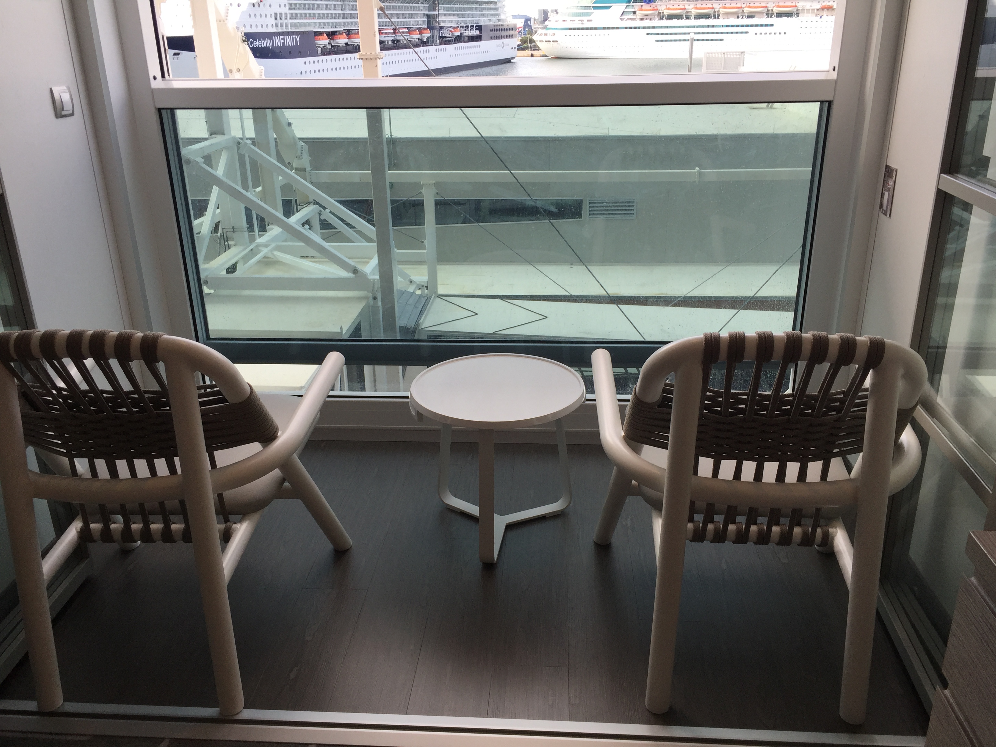 One, big one is that in the morning there is not a way to segment off the balcony effectively. You also have to have the blinds up in order to open the window. If one person wants to sit out on the “balcony” and enjoy a coffee, you basically wake up the other person because the window is noisy, takes about 30 seconds to open and you bath the room in sunlight to open it. Our room was on the Starboard side and we got a lot of noise from the magic carpet. You also get light from the Magic Carpet making it necessary to close the window so you can close the blinds. They should have moved the blinds back away from the window. Some rooms are actually visible from the Magic Carpet so beware when changing. The other issue is one of managing the staff. We had the window open one evening and around 2:00am they decided to power wash the decks. It seriously sounded like they were in the room with us. Seemed like something they could have done at another time.