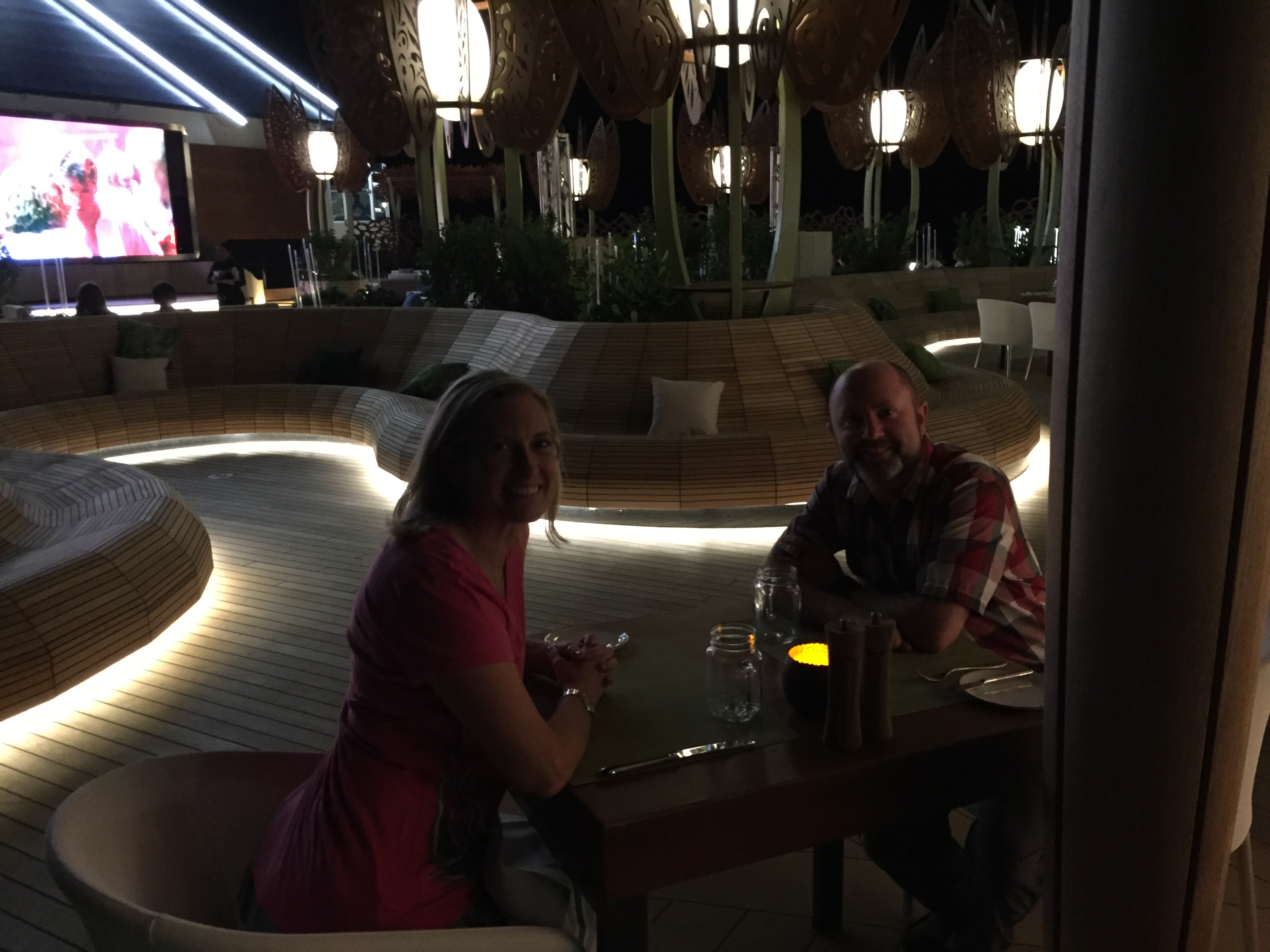The specialty dining, different story completely. This is what I had heard so much about and had been waiting to experience. We went to the Rooftop Bar and Grill. We did not have a reservation, but the hostess told us if we wanted to watch the movie, she was expecting a couple no-shows and we could have their table if they did not show up in 15 minutes. We took a seat and 5 minutes later she came over to seat us. We were able to continue to watch the movie, “Dirty Dancing” at our table under the stars. Very romantic setting. The food was incredible and the service was so outstanding, I actually went back to my cabin to get more money for a larger tip. By they way, tipping was not expected, I just wanted to do it because our server Rolondo was so outstanding. His recommendations were spot on. My only complaint is that we did not start with the dessert.