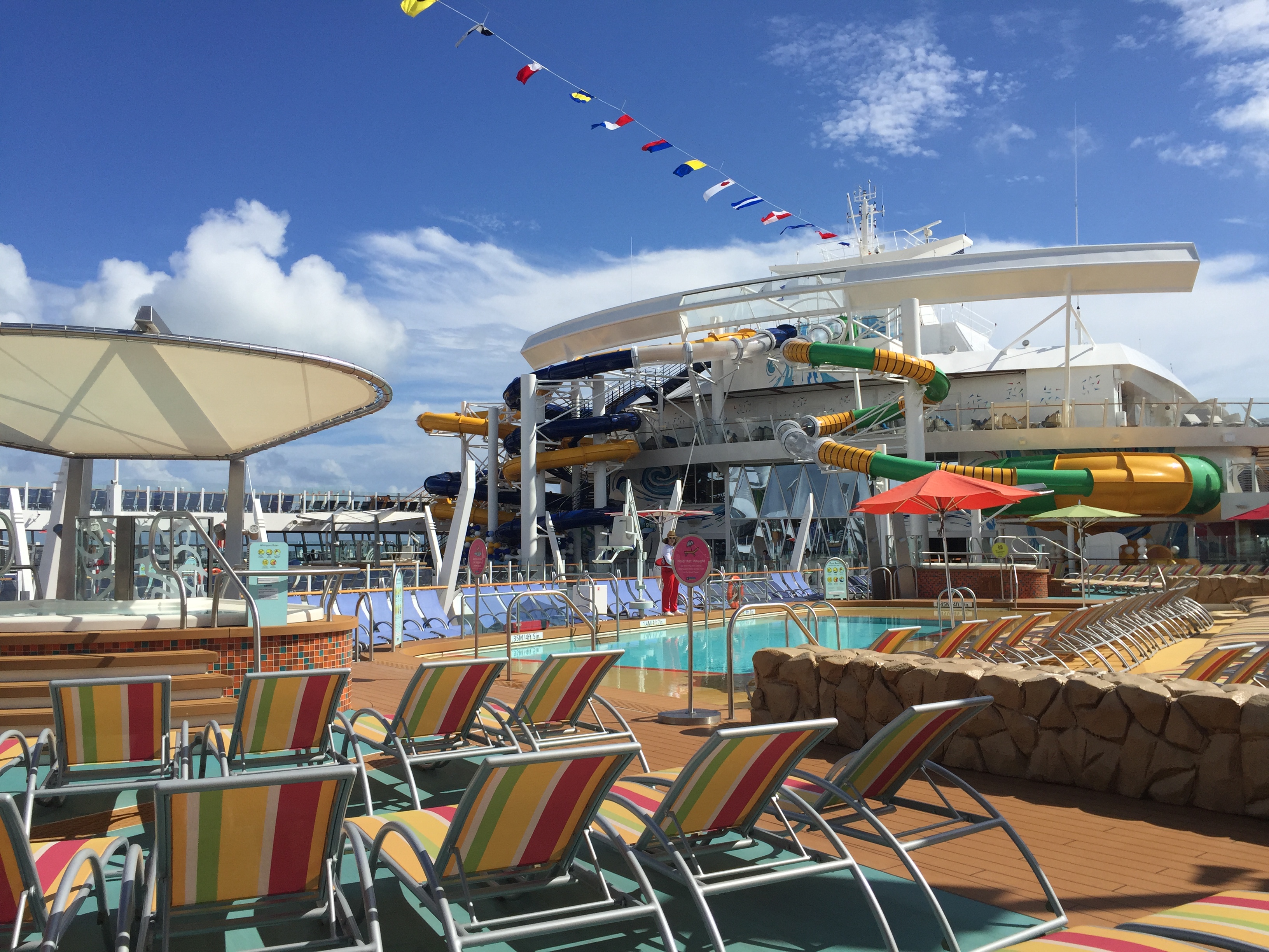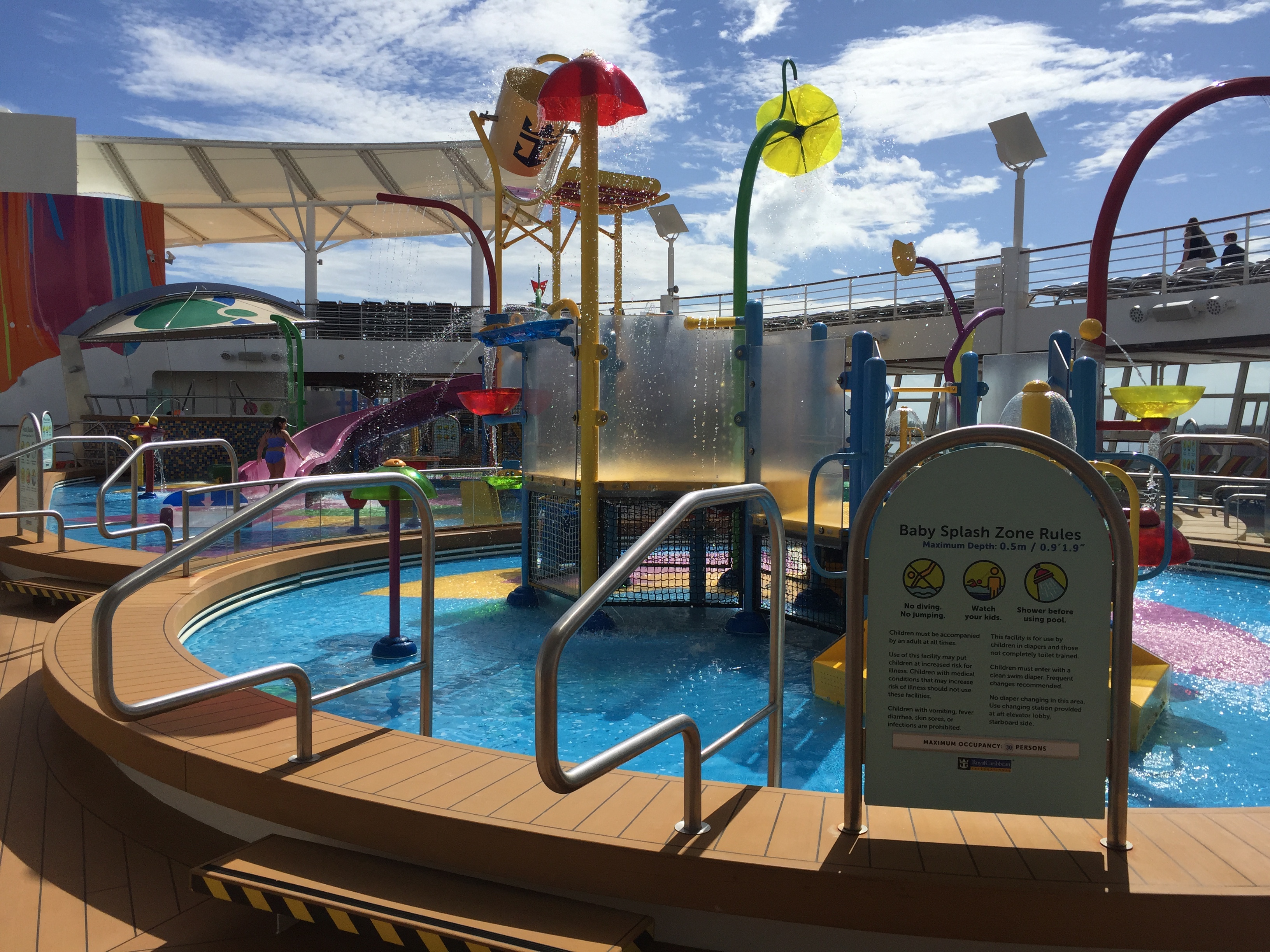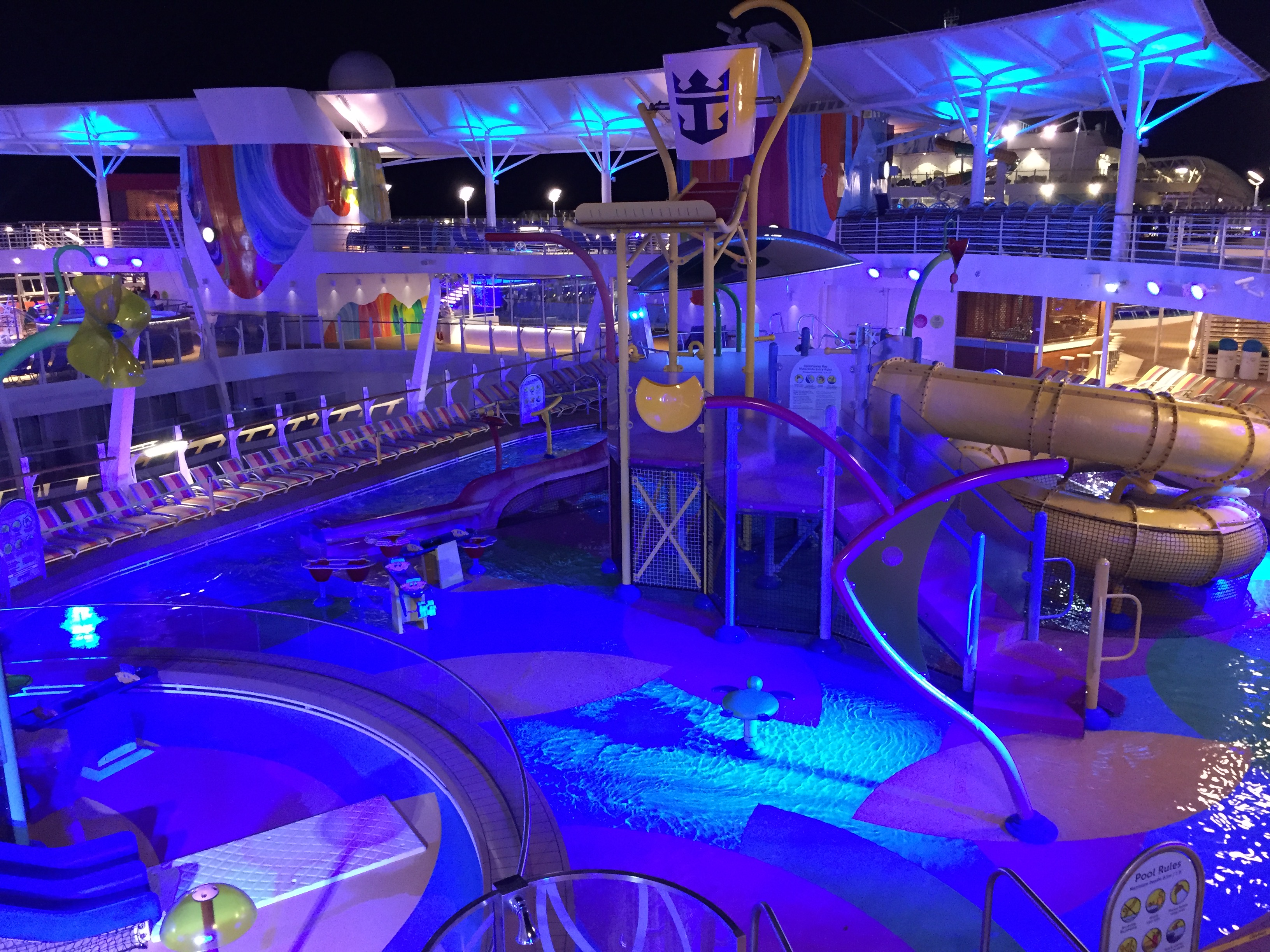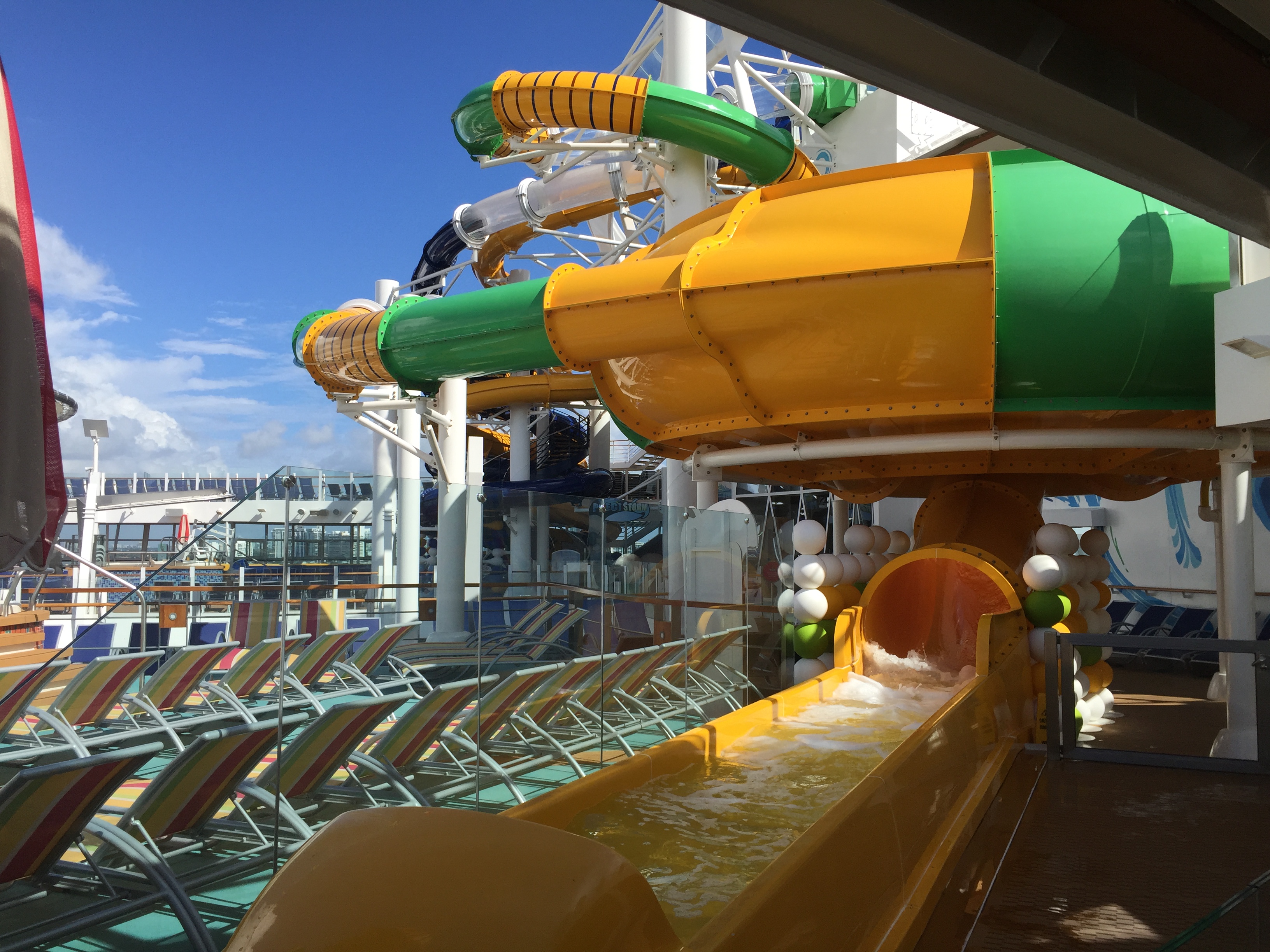 While we are on the subject of water, lets talk about pools and water slides. They have water slides for all ages. Their splash pad for the little guys is pretty cool. There are even little Adirondack chairs around the pool just for them. For the ones that are not strong swimmers there are children’s life jackets on board. For the big kids there are there larger slides. Beware the blue one. It is pitch black for most of the ride down. Caught me a little by surprise at first. The ship has multiple pools and hot tubs spread out around the upper deck. The adults only Solarium has a pretty cool pool, that I’m not sure what to call. It is like an infinity pool, but the edge is glass so you can see the people in it. My wife was not really a fan, but I thought it was pretty neat.
